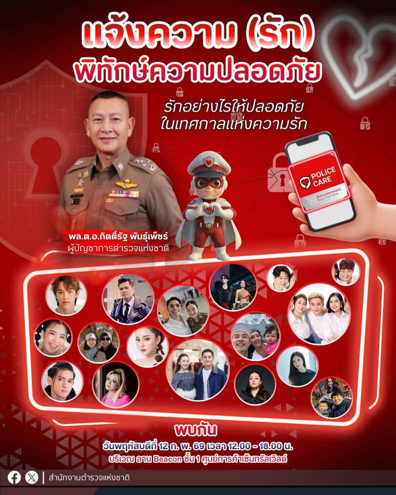สำนักงานตำรวจแห่งชาติเชิญชวนร่วมกิจกรรมก่อนวาเลนไทน์ เปิดตัวแอปพลิเคชัน “POLICE CARE” ณ ลาน Beacon ช