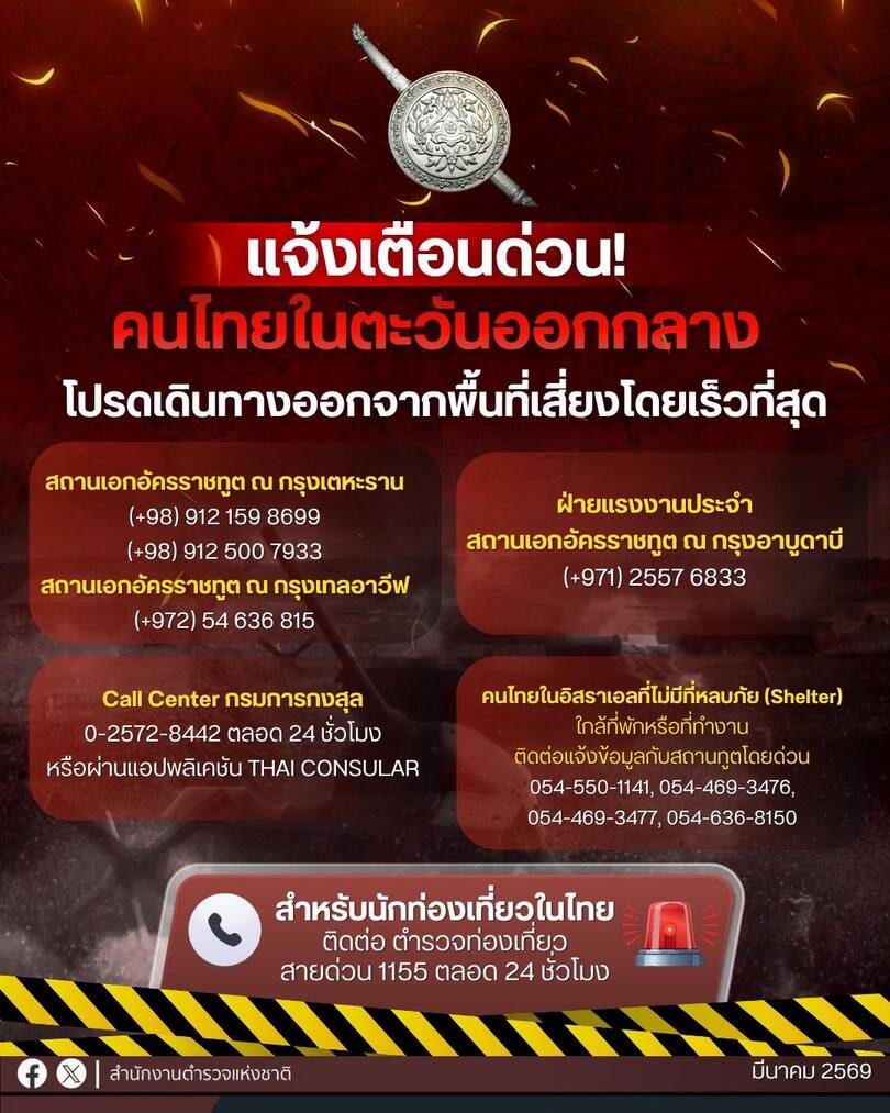 แจ้งเตือนคนไทยในตะวันออกกลางโปรดเดินทางออกจากพื้นที่เสี่ยงโดยเร็ว.สำหรับนักท่องเที่ยวที่อยู่ในประเทศ