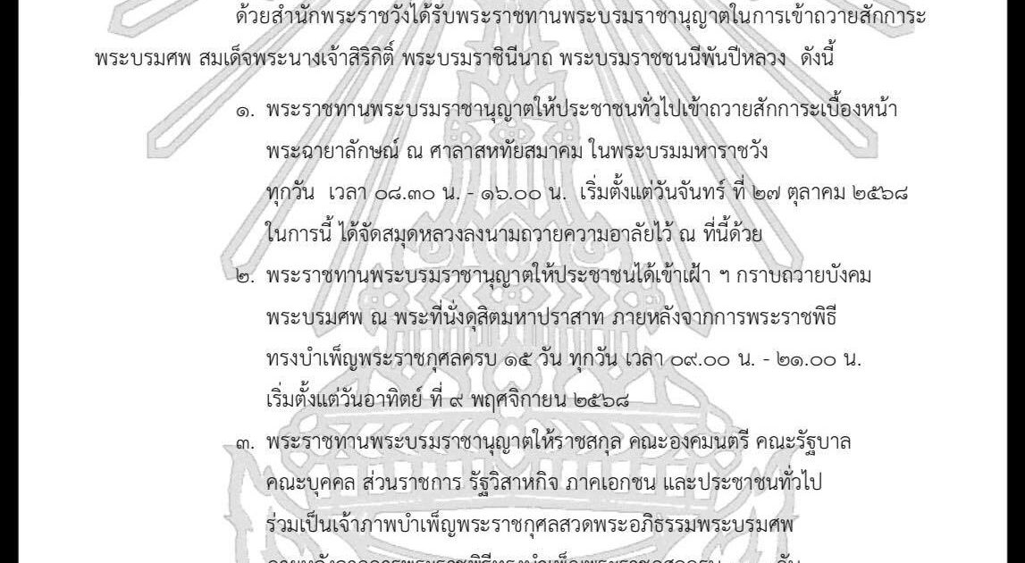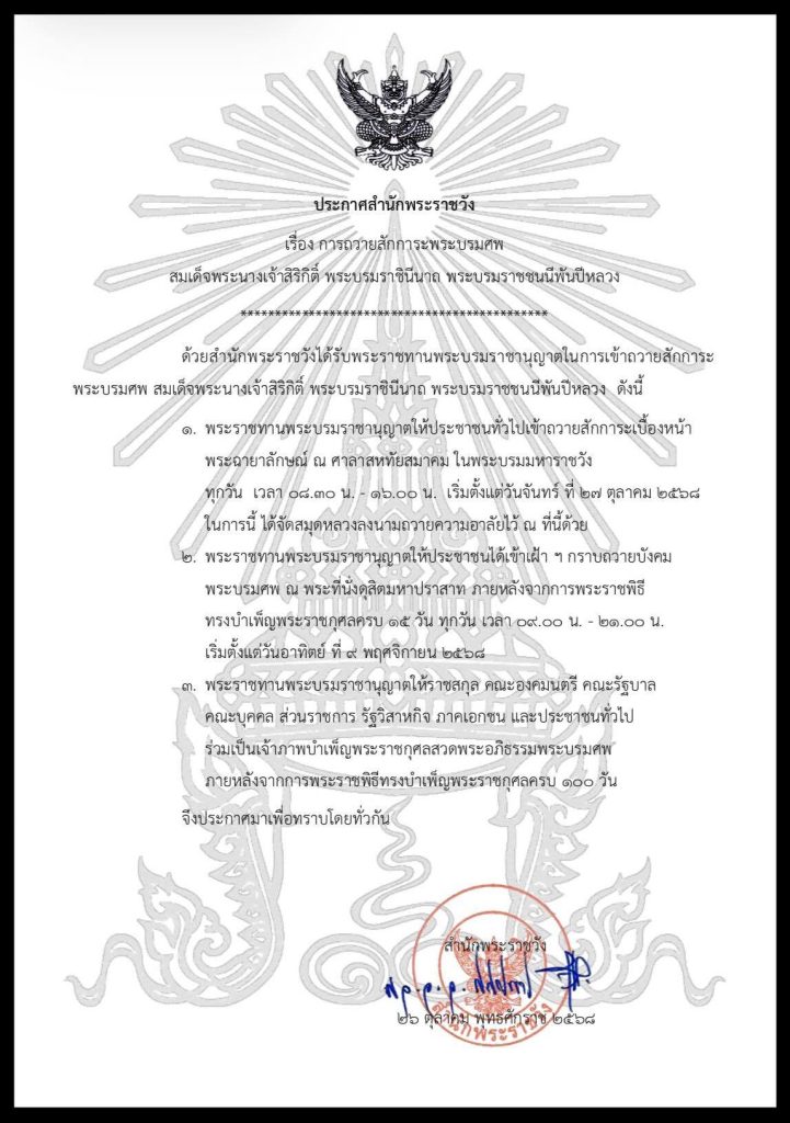 ประกาศสำนักพระราชวัง เรื่อง การถวายสักการะพระบรมศพ สมเด็จพระนางเจ้าสิริกิติ์ พระบรมราชินีนาถ พระบรมราชชนนีพันปีหลวง