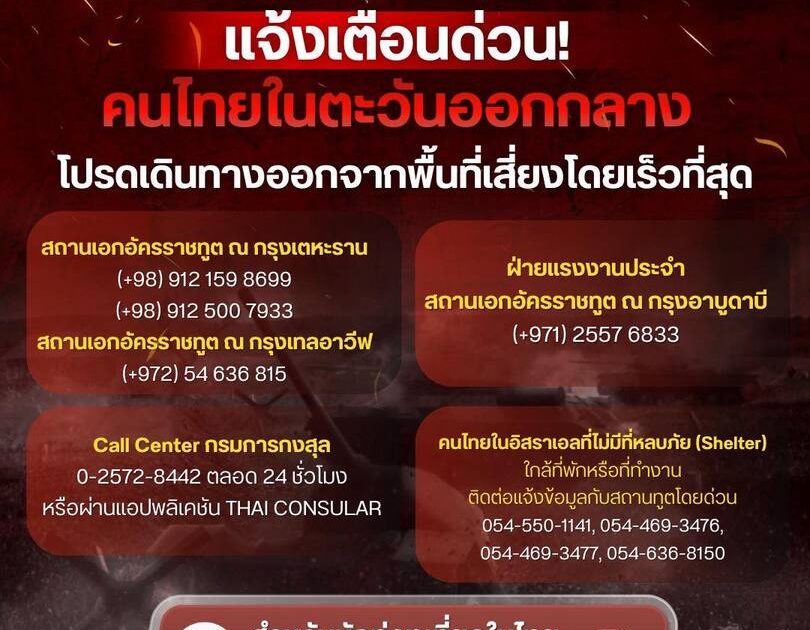 แจ้งเตือนคนไทยในตะวันออกกลาง 2 มีนาคม 2569 โดย admin / ข่าวประชาสัมพันธ์ 01 แจ้งเตือนคนไทยในตะวันออกกลางโปรดเดินทางออกจากพื้นที่เสี่ยงโดยเร็ว.สำหรับนักท่องเที่ยวที่อยู่ในประเทศไทยแนะนำให้ติดต่อผ่านตำรวจท่องเที่ยว สายด่วน 1155 มีล่ามแปลหลายภาษาและช่วยประสานงาน#สํานักงานตํารวจแห่งชาติ#Royalthaipolice FacebookFacebookXXLINELine