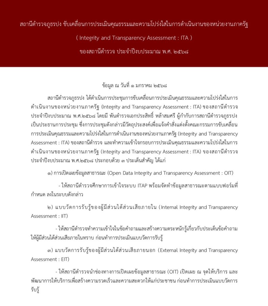 พ.ต.อ.ประสิทธิ์ หล้าสมศรี ผกก.สภ.ปง พร้อมด้วย หัวหน้าสายงานทุกสายงาน จัดประชุมชี้แจงเรื่องการประเมินคุณธรรมและความโปร่งใสของหน่วยงานภาครัฐประจำปีงบประมาณ 68 ให้ข้าราการตำรวจในสังกัดได้รับทราบเพื่อร่วมขับเคลื่อนการประเมินของหน่วยโดยชี้แจงผลการประเมินในปีที่ผ่านมาให้ทราบและถอดบทเรียนเพื่อนำจุดบกพร่องมาพัฒนาการประเมินตามตัวชี้วัดด้านต่าง ๆ ให้มีผลการประเมินที่ดีขึ้น